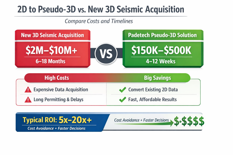 Padetech helps small and mid-size energy operators unlock the full value of existing seismic data through modern processing, structured data management, and cost-effective 2D-to-3D reconstruction.